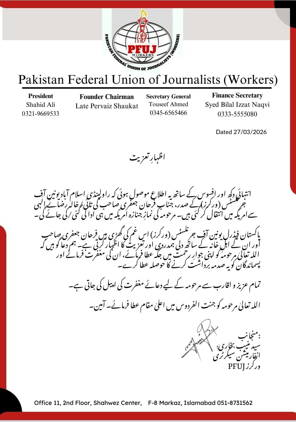پاکستان فیڈرل یونین آف جرنلسٹس (ورکرز) کی قیادت نے راولپنڈی اسلام آباد یونین آف جرنلسٹس (ورکرز) کے صدر جناب فرحان جعفری کی خالہ کے انتقال پر گہرے دکھ اور افسوس کا اظہار کیا ہے۔ مرحومہ طویل علالت کے بعد امریکہ میں انتقال کر گئی ہیں۔​موصولہ اطلاعات کے مطابق، مرحومہ کی نمازِ جنازہ اور تدفین امریکہ میں ہی ادا کی جائے گی۔ فرحان جعفری کی ہمشیرہ کے انتقال کی خبر سن کر صحافتی برادری میں غم کی لہر دوڑ گئی ہے۔​​پی ایف یو جے (ورکرز) کے مرکزی عہدیداران بشمول صدر شاہد علی، سیکرٹری جنرل اور فنانس سیکرٹری سید بلال عزت نقوی نے اپنے مشترکہ بیان میں فرحان جعفری اور ان کے سوگوار خاندان سے دلی ہمدردی کا اظہار کیا ہے۔ انفارمیشن سیکرٹری سید منیب بخاری کی جانب سے جاری کردہ پیغام میں کہا گیا ہے کہ دکھ کی اس گھڑی میں پوری یونین فرحان جعفری کے غم میں برابر کی شریک ہے۔​یونین کی قیادت اور صحافتی برادری نے اللہ تعالیٰ سے دعا کی ہے کہ وہ مرحومہ کو اپنی جوارِ رحمت میں جگہ عطا فرمائے، ان کی مغفرت کرے اور پسماندگان کو یہ صدمہ برداشت کرنے کا حوصلہ اور صبرِ جمیل عطا کرے۔ تمام دوست احباب اور عزیز و اقارب سے مرحومہ کے لیے دعائے مغفرت کی اپیل کی گئی ہے۔