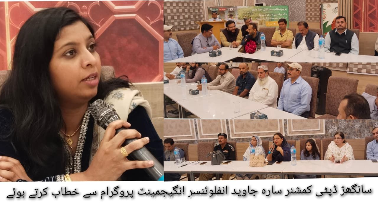 سانگھڑ بچوں کو پولیو جیسے موذی مرض سے محفوظ بنانے اور اس کے مکمل خاتمے کے عزم کے تحت ضلعی انتظامیہ اور یونیسف کے تعاون سے گزشتہ رات نجی ہوٹل میں انفلوئنسر انگیجمنٹ پروگرام کا انعقاد کیا گیا۔ اس موقع پر خطاب کرتے ہوئے ڈپٹی کمشنر سارہ جاوید نے کیا کہ اس پروگرام کا مقصد معاشرے کے بااثر افراد، سوشل میڈیا انفلوئنسرز اور مقامی رہنماؤں کو پولیو کے خلاف جاری مہم میں فعال کردار ادا کرنے کے لیے متحرک کرنا تھا کیونکہ ہم سب مل کر اس مرض کو ہمیشہ کے لیے ختم کر سکتے ہیں. اس موقع پر ماہرین صحت اور متعلقہ حکام نے شرکاء کو پولیو وائرس کے خطرات، اس سے بچاؤ اور ویکسین کی اہمیت کے بارے میں تفصیلی آگاہی فراہم کی۔ مقررین کا کہنا تھا کہ پولیو کا مکمل خاتمہ صرف اسی صورت ممکن ہے جب معاشرے کے تمام طبقات مل کر اس قومی مہم کا حصہ بنیں۔ پروگرام میں شریک انفلوئنسرز نے اس عزم کا اظہار کیا کہ وہ اپنے پلیٹ فارمز کے ذریعے پولیو سے متعلق مثبت پیغام عام کریں گے اور والدین کو اپنے بچوں کو پولیو کے قطرے پلانے کے لیے قائل کریں گے۔