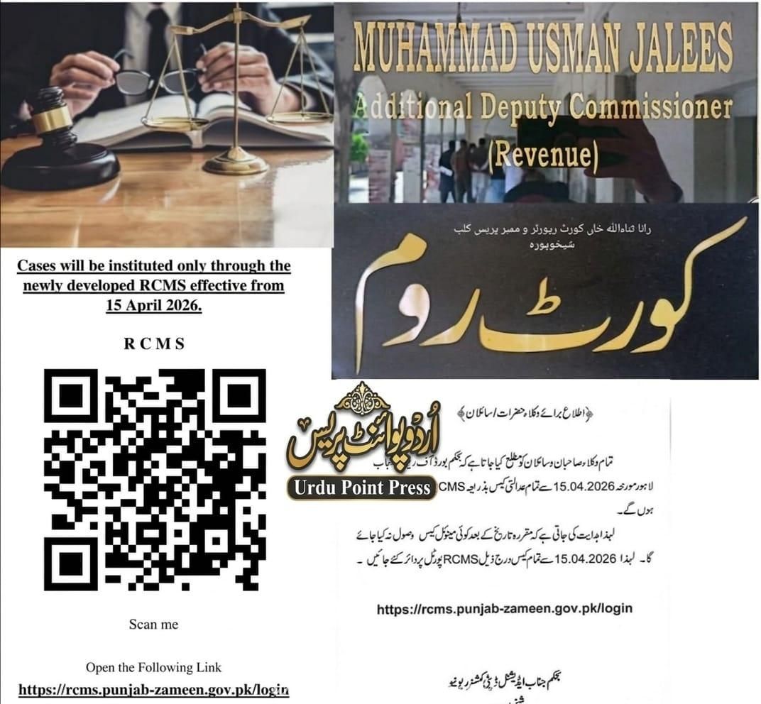 ایڈیشنل ڈپٹی کمشنر ریونیو شیخوپورہ محمد عثمان اجلیس کی جانب سے ایک اہم حکم جاری کیا گیا ہے جس کے مطابق تمام وکلاء حضرات کو مطلع کیا جاتا ہے کہ بورڈ آف ریونیو پنجاب، لاہور کی ہدایات کے پیش نظر 15 اپریل 2026ء سے تمام عدالتی کیسز کو لازمی طور پر پورٹل کے ذریعے درج کیا جائے گا۔ حکم کے مطابق مقررہ تاریخ کے بعد کسی بھی کیس کی اندراج کے لیے دستی کارروائی قابل قبول نہیں ہوگی، لہٰذا تمام کیسز کی رجسٹریشن صرف آن لائن پورٹل کے ذریعے ہی ممکن ہوگی۔ ایڈیشنل ڈپٹی کمشنر ریونیو نے مزید ہدایت کی ہے کہ تمام متعلقہ وکلاء اور سائلین اس نئی ہدایت پر عملدرآمد کو یقینی بنائیں تاکہ عدالتی امور میں شفافیت اور بہتری لائی جا سکے۔ واضح رہے کہ پورٹل تک رسائی کے لیے درج ذیل لنک فراہم کیا گیا ہے:قانونی حلقوں نے اس اقدام کو سراہتے ہوئے کہا ہے کہ اس سے کیسز کے اندراج اور مانیٹرنگ کے نظام میں بہتری آئے گی اور شفافیت کو فروغ ملے گا۔